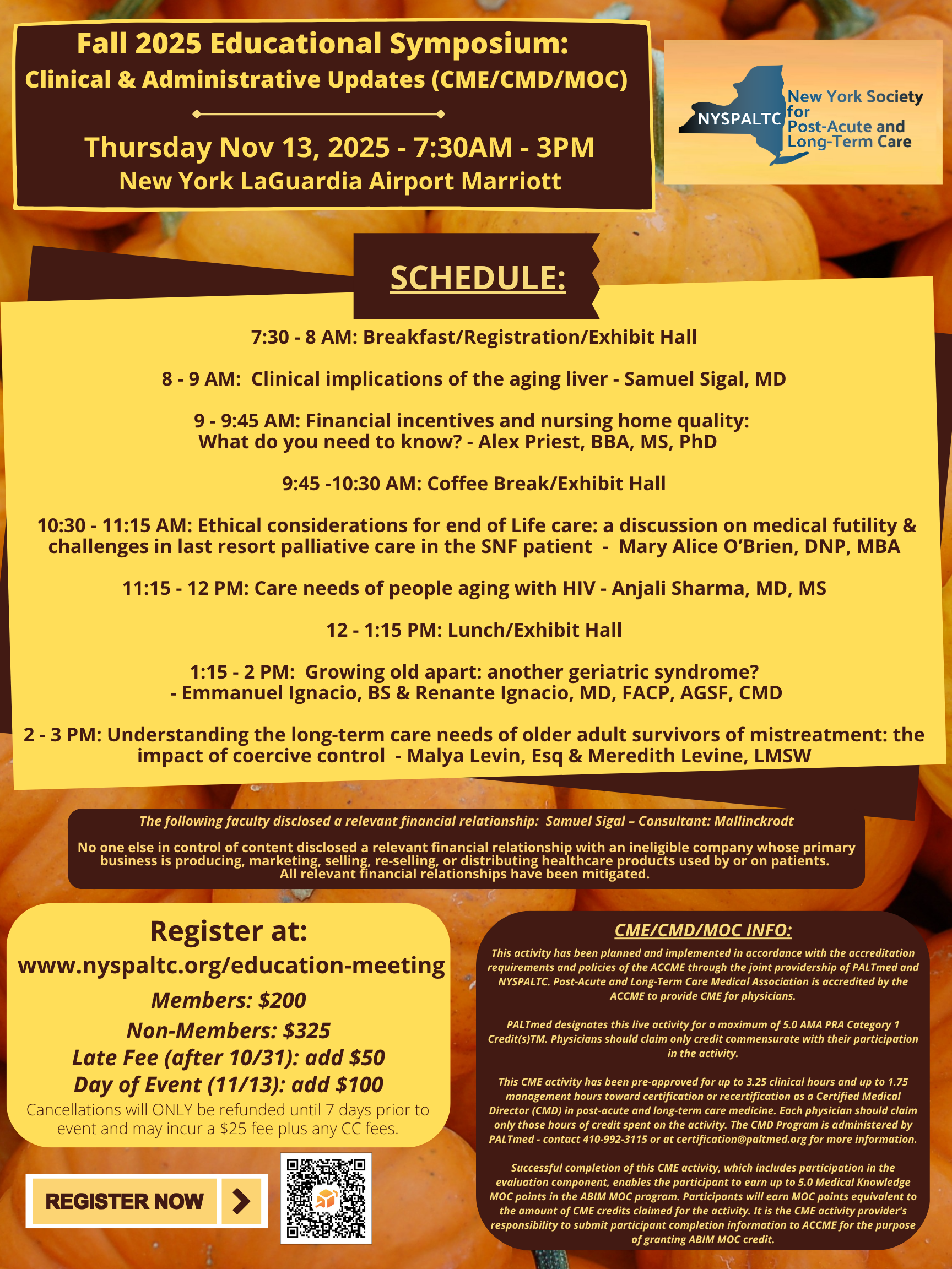 The New York Society for Post-acute and Long-term Care (NYSPALTC) offers free registration to qualified Geriatric Fellows or Internal Medicine/Family Practice Residents to attend either of its twice yearly educational meetings. Meetings take place in May in Albany, NY and November in Queens, NY. It's a great opportunity to meet many of the leaders in Geriatric Medicine in NY State while attending these educational events.